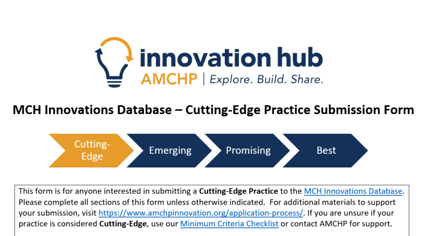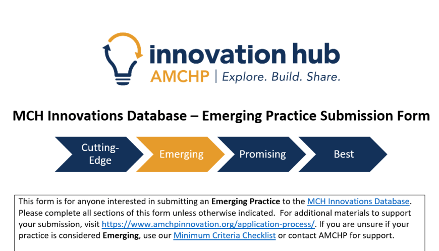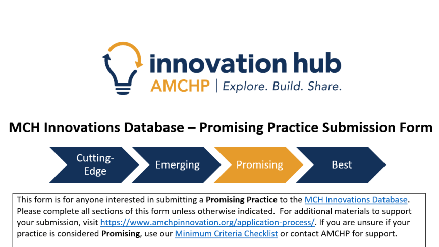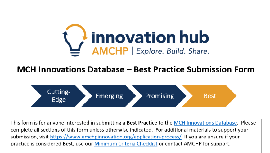 To submit a practice, email a completed submission form to evidence@amchp.org with the subject line “MCH Innovations Database – Practice Submission”. Please contact evidence@amchp.org with any questions or concerns, and we are happy to assist.