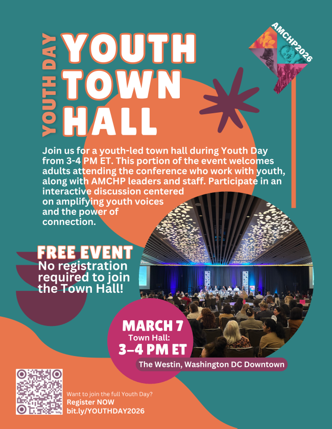 Conference attendees working with youth and AMCHP staff and leadership are welcome to join for FREE the Youth Town Hall during Youth Day, taking place from 3 – 4 PM ET on Saturday, March 7, at AMCHP 2026.