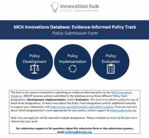 AMCHP considers MCH policies for three policy designations: evidence-informed policy development, policy implementation, and policy evaluation. Email us at evidence@amchp.org to learn more about the requirements for each of these designations.