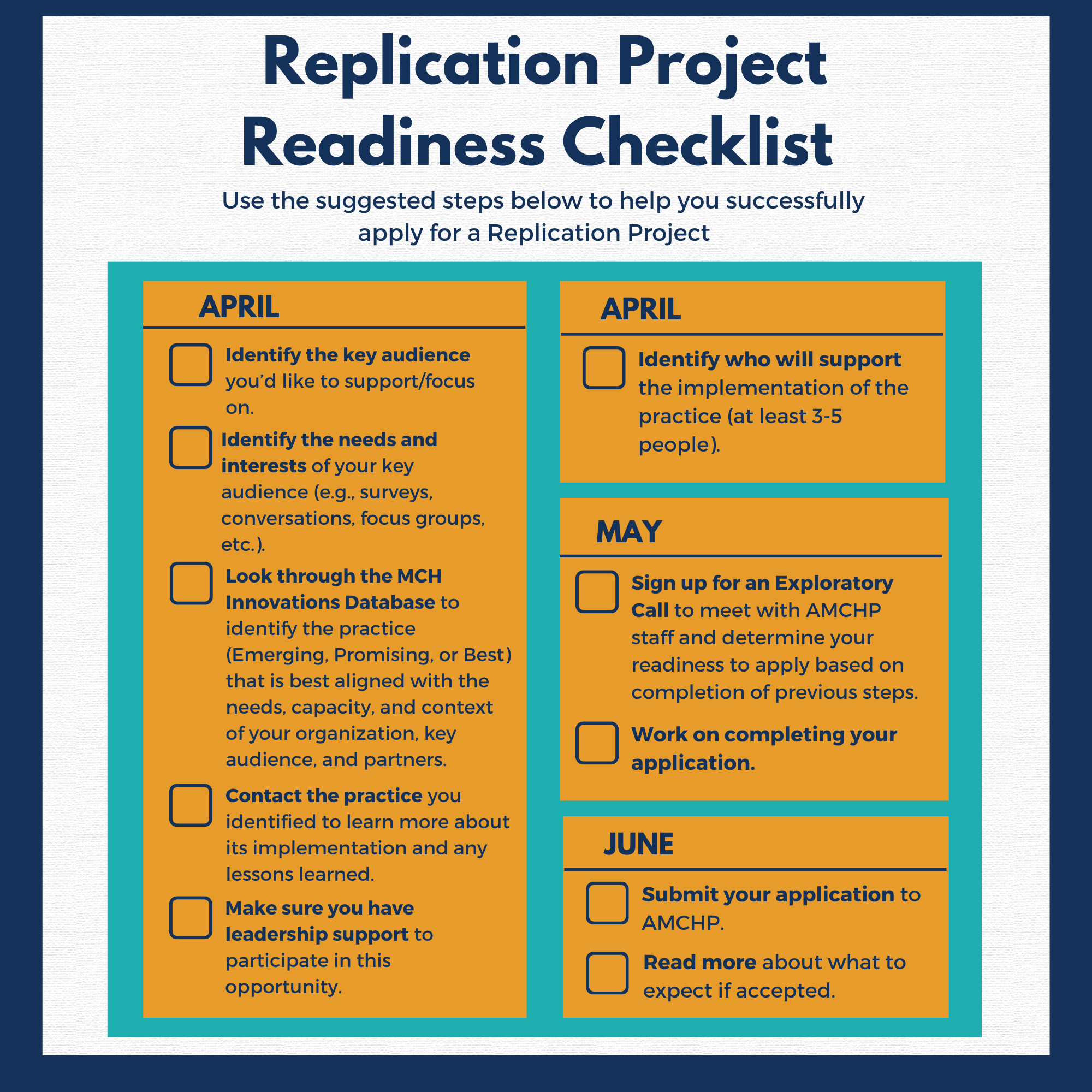 - The first step in the application process is to complete the items under “April” on the Readiness Checklist. This resource consists of recommendations that will help you apply for a Replication Project.