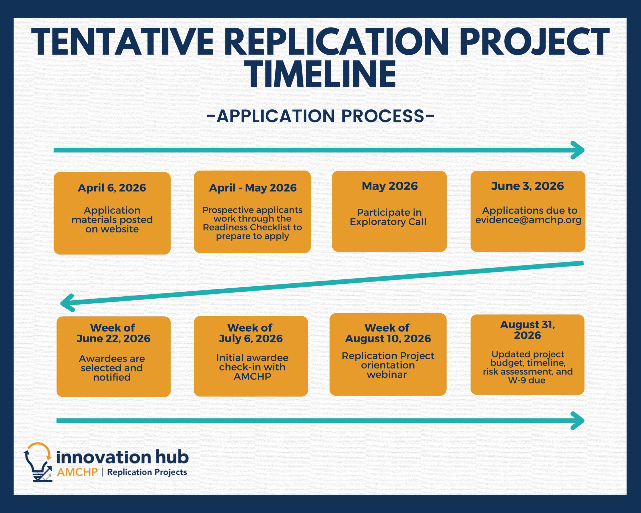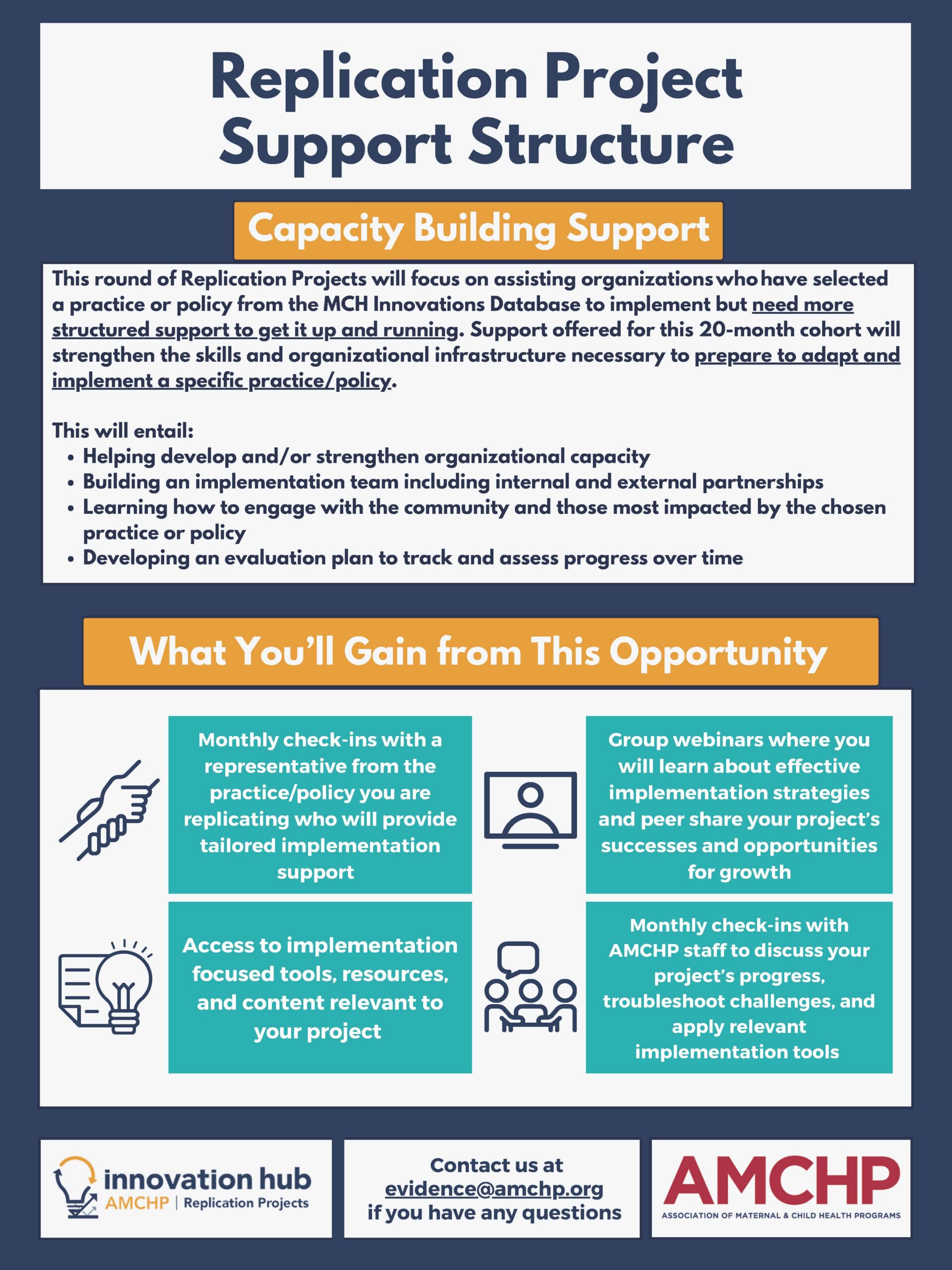 The 2026-2028 AMCHP Replication Project will run from approximately July 2026 – April 2028. For this 20-month cohort, AMCHP offers three $25,000 awards as well as customized support depending on an organization’s readiness to replicate an Innovation Hub policy/practice and information gathered during the Exploratory Call.