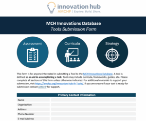 AMCHP is excited to be piloting our new Tool submission category for our MCH Innovations Database! Over the course of previous biannual reviews, the Innovation Hub has received feedback that the current Practice and Policy submission categories do not appropriately encompass all types and formats of innovations that support positive outcomes for MCH populations. The goal of spotlighting tools in the MCH Innovations Database is to share examples of tools or other aids that are being used to eliminate obstacles to and promote community wellness among MCH populations. Through including tools in the MCH Innovations Database, AMCHP hopes to expand the use of the database and support MCH professionals in addressing a greater range of MCH challenges.